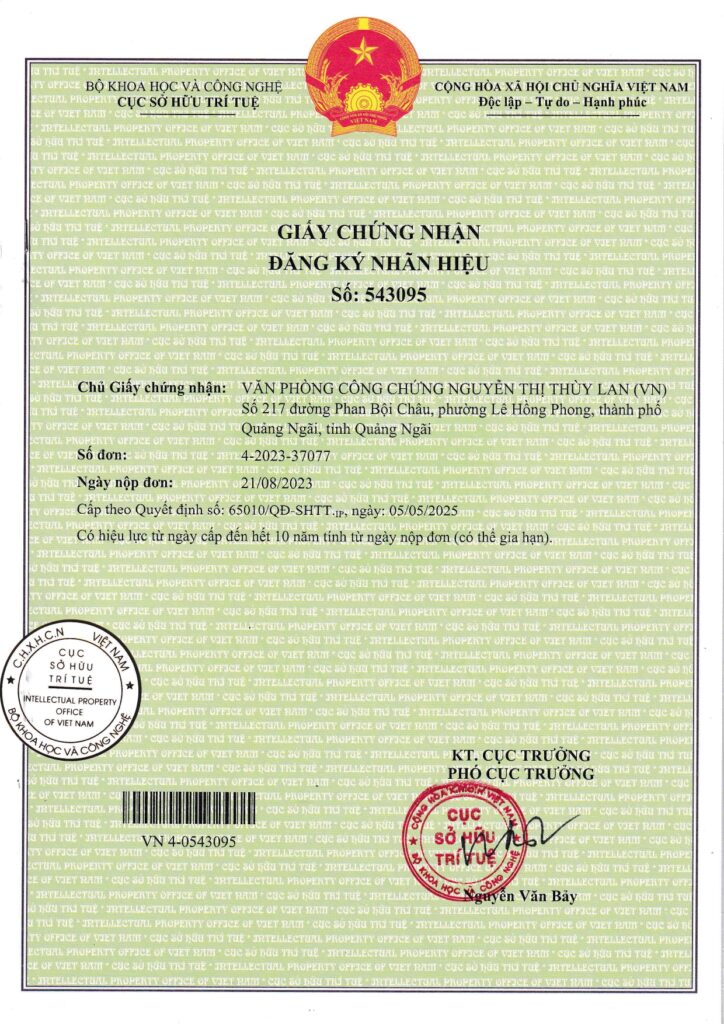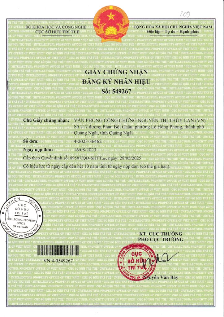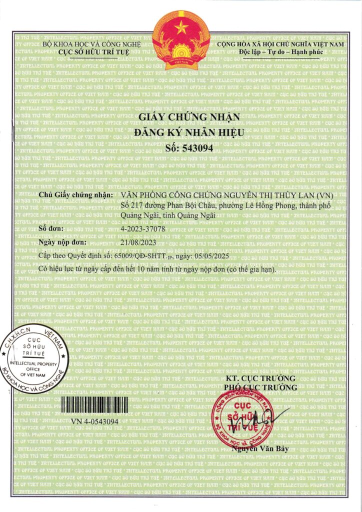 Văn phòng công chứng Nguyễn Thị Thùy Lan (“Văn phòng”) đã được UBND tỉnh Quảng Ngãi đã cho phép thành lập theo Quyết định số 547/QĐ-UBND ngày 15/06/2023 và được Sở Tư pháp tỉnh Quảng ngãi cấp Giấy đăng ký hoạt động số: 28/TP-ĐKHĐ-CC ngày 26/07/2023, Văn phòng sẽ chính thức đi vào hoạt động kể từ ngày 14/08/2023. Văn phòng công chứng Nguyễn Thị Thùy Lan là tổ chức hành nghề công chứng thứ 7 tại thành phố Quảng Ngãi và là tổ chức thứ 25 của tỉnh Quảng Ngãi, qua đó sẽ tạo cơ hội cho các cá nhân, tổ chức có thêm nhiều lựa chọn trong quá trình công chứng. Điều này cũng góp phần làm cho hoạt động công chứng tại Quảng Ngãi ngày càng phát triển, hoàn thiện hơn để đáp ứng nhu cầu công chứng cũng như thúc đẩy tiến trình xã hội hóa hoạt động công chứng trên địa bàn tỉnh Quảng Ngãi theo chính sách pháp luật của Nhà nước.